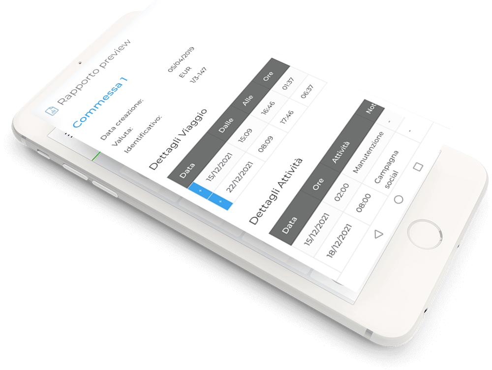 Con pochi click è possibile creare un documento che riassume nel dettaglio le attività svolte e le relative ore di lavoro impiegate, il resoconto dei viaggi con tempo e km percorsi e l’elenco delle spese sostenute per esempio, pasti, pernottamenti o acquisto di materiali